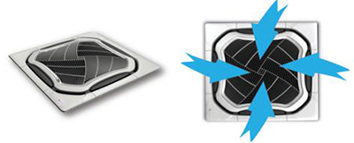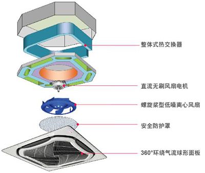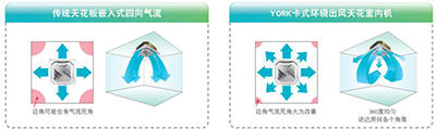 與平面回風格柵相比,約克卡式天花室內機(環(huán)形出風)獨有的球面回風格柵具有更大的回風面積,風量大噪音低,在回風氣流組織方面也更合理;同時更美觀大方。
